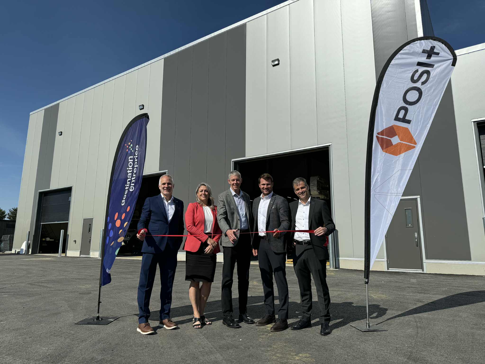 Sur la photo, dans l'ordre habituel: Eric Lefebvre (député de Richmond-Arthabaska), Julie Gagnon (DG de Destination Entreprise), Dany Poudrier (président de Posi-Plus), Antoine Tardif (maire de Victoriaville et président de Destination Entreprise) et Alex Boissonneault (député d'Arthabaska-L'Érable).